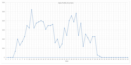 Numerical data have attributes Item no., Time and Quantity sold in Table 1. Quantity was aggregated weekly per item to create a new feature termed Sales Profile, and the step was repeated for each item using Equation (4), and a sample of the profile of an item is shown in Figure 7.