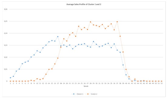 Clustering was performed on the sales profile produced in Section 3.3. As a result, we computed Silhouette scores for each number of clusters to determine the optimum number of clusters in a dataset. The highest Silhouette score from Table 2, that is, 0,994, corresponded with the two clusters; therefore we chose two clusters of products’ sales profiles while performing k-means clustering. The average sales profile of two clusters C1 and C2 is shown in Figure 8. It can be observed that both the clusters exhibit varying average sales profiles. The average sale for C1 is from week 10 to week 43, and for C2, from week 1 to week 45. The obtained clusters are used as labels for the classification task discussed in the next section.