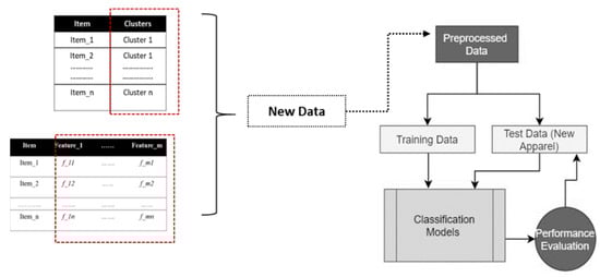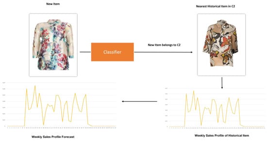 This paper addresses the limitations of the classical forecasting system by proposing a novel approach for building an intelligent demand forecasting system using advanced machine learning methods and historical product image data. A complete research workflow is shown in Figure 1, which consists of several steps explained in detail in Section 3.1. Machine learning clustering models are applied to a real historical dataset of fashion products, the outcome of which are the two main clusters of the products based on their historical sales. The newly arrived fashion product item is then matched with these two clusters, and the model predicts which one of these two clusters the newly arrived fashion item belongs to. Our model predicts a new item’s sales based on the nearest match it finds in the two clusters and the associated sales profile of a matched product. The performance of the models evaluated on the test dataset and the results from our study were found to be effective and promising for predicting a new fashion product’s sales.
