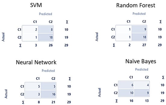 A confusion matrix was created for all four classification models, as shown in Figure 10, for examining the corrected classified items with the actual data. The test dataset consists of 29 items, of which 10 items go to C1, and 19 items go to C2. Items in C1 were poorly classified by SVM and RF, whereas NN and NB correctly classified 50%. Items in C2 were poorly classified by NB, while approximately 80% were classified correctly by SVM, RF, and NN. Further, ROC curves, as shown in Figure 11 and Figure 12, for each target class label, that is, C1 and C2, were plotted for all models to demonstrate the classification models’ results. It could be observed that NN has a better curve for both the clusters. Overall, NN shows a better prediction for both the clusters. Hence, based on the results, the NN model is the best model for this classification task, and the results of the test items in both the clusters will be assessed for forecast performance evaluation.
