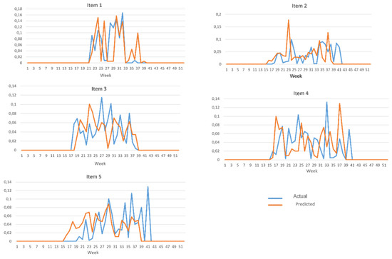 In the illustrations of five items of C1, as shown in Figure 14, we can see that items 1, 2, 3, and 5 are following the trend of the actual sales with some fluctuations from week 29 to week 37. The sales for the items were predicted before the actual sales, that is, from week 16, and it shows no sales after week 39, so two weeks lag was seen in this case.