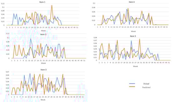 The predicted sales profiles of correctly classified five items from both clusters are illustrated in Figure 14 and Figure 15. The results clearly show that the model prediction was reasonably accurate as it is closer to the value of actual sales.