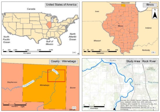 The study area is within the reach of Rock River, located in north-central United States, which flows from Horicon Marsh near Brandon in Fond du Lac County in a southwest direction, joining Mississippi River at Rock Island, Illinois. The lower course bottomland of this river reach is prone to spring flooding, necessitating levee protection. Our research region extends from Rockton city at the upstream to Machesney Park at the downstream, as seen in Figure 1. These places also serve as the United States Geological Survey (USGS) gage station sites, with the upstream station (Station ID 05437500) located at 42°27′01″ N, 89°04′21″ W with an elevation of 215.72 m above NAVD88 and the downstream station (Station ID 05437610) located at 42°22′08″ N, 89°03′31″ W with an elevation of 212.95 m above NAVD88. The reach of the study area is 20.72 km long. The watershed area of the river at the upstream station is approximately 16,480 km2. The gage station discharge data from the upstream are used as observed data for bias-correcting the climate model data, and the gage station gage height data are used for the calibration and validation of hydrologic modelling using HEC-RAS. Details about these steps are further explained in sections below. The site has suffered from spring flooding mainly due to unexpected precipitation. The most recent flood event in Machesney Park was in 2019, due to the combination of sleet and freezing rain. This study further uses the Flood Insurance Map developed by FEMA at this site to validate the HEC-RAS model and compare the inundation extend with future projected data.