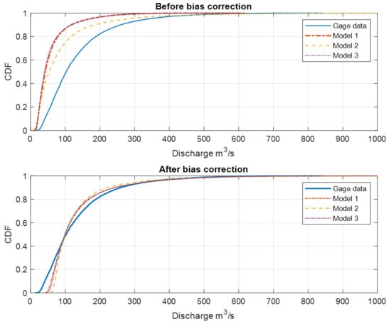 CDF curve before and after bias correction. The blue line represents the CDF plot for the gage station data set, while other lines are from the three models considered in this research study.