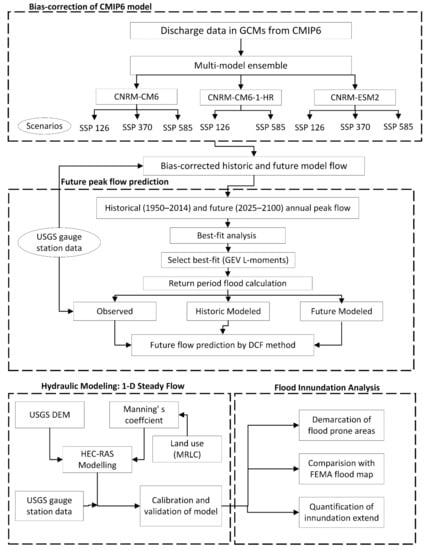 DCF is calculated for every scenario and return period. A higher value of DCF is considered for this study, such that the maximum increase in flood data in the future could be used. The methodology framework that is used for the overall procedure of this study is illustrated by Figure 3.
