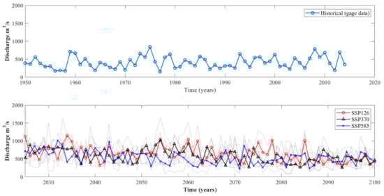 This study uses the gage station discharge data as the observed data set for the time- period ranging from 1950 AD to 2014 AD. This gage station data set served as an observed data for bias correcting the CMIP6 data set so that the uncertainty of the climate model could be handled, and biases could be minimized. Firstly, the observed value and the historical model value were bias-corrected, and the final values post-bias-correction were analyzed. Prior to the bias correction method, the significant difference in the CDF curve between the modeled and the observed values can be seen as depicted in Figure 4. Annual peak flow for historical (top) and future modeled (bottom) datasets. The bold lines in the future peak flow plot are the mean of ensemble model for each scenario, and three different markers represents the scenarios, as shown in the legend in the plot. Similarly, the figure also shows that the bias in terms of the CDF curve has been dealt with since the difference between the plots looks very small. Using the same transformation factor, the future flood values were determined for all the variant levels and the models, which comprise a total of 43 data points. Ensemble means of the modeled future data yielded the yearly hydrograph for the three scenarios (SSP126, SSP370, and SSP585). The goal of this research is to understand the risk of extreme river discharge, and so maximum annual flood is considered for the purpose of this study. Figure 4 (top) shows the yearly hydrograph that is obtained from the observed gage station data, and Figure 4 (bottom) shows the same for the future bias-corrected data for every model. The lighter shade of hydrograph in Figure 5 represents all the models and variants considered, while the darker lines are the final ensemble values in different scenarios. This represents the uncertainty that the climate model offers and thus corroborates that there is a need to minimize such uncertainties and biases in the model. This hydrograph shows an increase in annual peak discharge for the future projected data as compared to historical data, determining possible flooding escalation in the future. More extreme values are caused because of the lower-intensity scenario as opposed to the higher-intensity scenario.