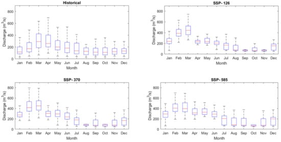 This study mostly focused on the peak discharge projection which hides the flow pattern over the years and so monthly variation for the historical and future time-period is analyzed. Upon carefully analyzing the monthly discharge data, it can be visualized that both the minimum and maximum extreme values have increased in the future scenarios, especially in the months of January, February, and March. This result can be visualized in Figure 5. Monthly peak variation over the years is given for historical period and future projected scenario for three emission scenarios. However, in the month of April, though the historical data showed higher extreme values, the future model predicts lower value for the same. This foretells that climate change will alter the precipitation pattern, considering there is significant change in the monsoon season. The peak value of flow changed from the month of April in the historical time period to the months of February and March in the future time period. This suggests that not only will there be an increase in peak flow in some months, but that the month in which the peak flow occurs will also change in the future.