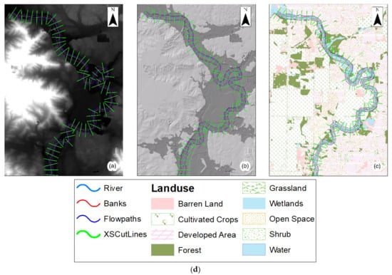 River centerline, bank line, flow path line and cross-sections in (a) digital elevation model (DEM); (b) terrain file (TIN); and (c) over land use. (d) The legends for the maps.