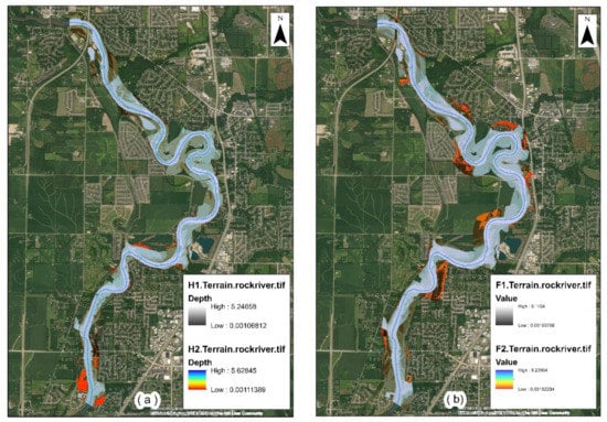 Flood extent inundation map for (a) historical peak discharge (H1 (100-yr): 909.37 m3/s and H2 (500-yr): 1069.25 m3/s; (b) future peak discharge (F1 (100-yr): 2273.42 m3/s and F2 (500-yr): 3205.70 m3/s).