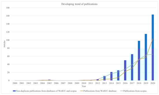The historic developing trend of publications related to the topic of big data and predictive analytics applied to BI is presented in Figure 1. As Figure 1 shows, the total number of non-duplicate literature from WoSCC and Scopus is in an increasing trend by 2011, this trend seems to be continuing in the next few years. The same trend occurred in WoSCC and Scopus databases, where the developing trend is more significant for Scopus after 2015. Besides, before 2019, the number of papers from WoSCC is more than Scopus, the situation is reversed in 2020.