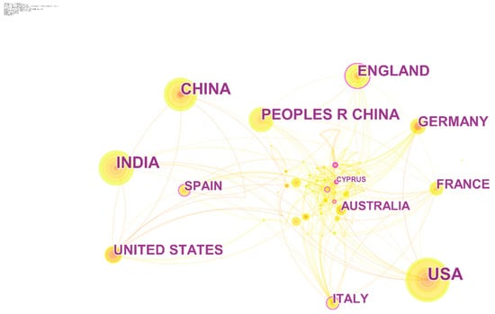 A country distribution map is generated in Figure 2, with the top 5 academic contributed countries ranked by the number of publications, as listed the Table 1. Based on the figure and table mentioned, findings show that the USA presents a significant advantage in the research of big data and forecasting analytics for BI, with the count and centrality value of publications of 93 and 0.1. Countries of India (count = 76, centrality = 0.08), China (count = 71, centrality = 0.02), England (count = 54, centrality = 0.11) and Germany (count = 38, centrality = 0.04) are listed as the second, third, fourth and fifth influential countries. Moreover, with 63 notes and 241 links (density = 0.1234) displayed in Figure 2, the cooperation between countries is relatively weak and should be paid attention to.