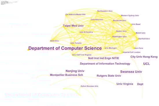 As Figure 3 and Table 2 shown, the distribution of institutions is exhibited, sorted by the number of publications. The most contributed institution is the department of Computer Science, University of Nevada, Las Vegas, NV, the United States (count = 16), followed by Swansea University, UK (count = 6), the University College London (UCL) (count = 6), Nanjing University, China (count = 5), and National Institute of Industrial Engineering (NITIE), Maharastra (count = 4). Otherwise, with 119 notes and 190 links (density = 0.0271) illustrated in Figure 3, the collaboration between institutions is weak, and should be focused on in the future.