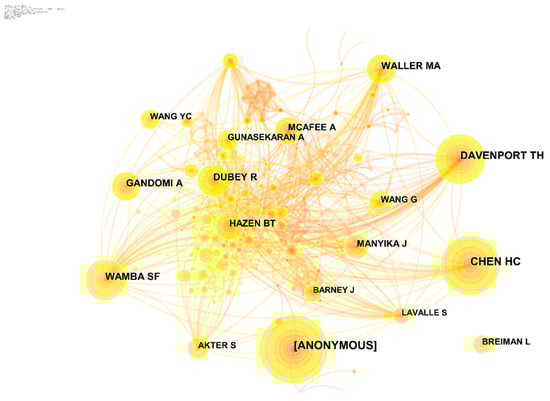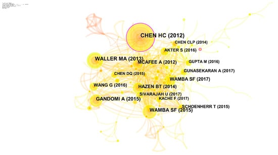 The distribution of cited authors is displayed in Figure 5. According to the centrality value, the top 5 authors and their representative works are listed in Table 4. The most influential scholar is regarded as Davenport, T.H. (count = 71, centrality = 0.1), his work “Big data: the management revolution” [] is released in 2012. This article proposes several valuable BI strategies for the company decision-making process, which is widely cited by other researchers (cited by 5735 times according to Google Scholar, the search date is 7 November 2021). The works of other four top scholars are all related to the topic of big data analysis and BI [,,,]. Besides, with 341 nodes and 974 links involved in Figure 5, it is indicated that cooperation between scholars should be encouraged.