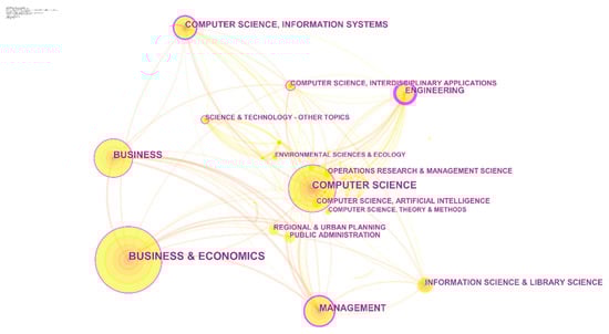 The distribution of disciplinaries is exhibited in Figure 7. The top 10 categories are listed in Table 6. It is clustered into the following categories, which are big data, business, management and economics, computer science, interdisciplinary applications, machine learning, economics, engineering, computer science, big data analytics, artificial intelligence, and mathematics. Seven of the ten disciplines are data science, computer science, mathematics, and engineering-based categories. Two of the ten disciplines are involved in economy, business, and management. A category of interdisciplinary applications is uniquely included. Furthermore, with 50 nodes and 165 links (density = 0.1347) exhibited in Figure 7, it indicated that the interdisciplinary cross-field subjects should be paid more attention to, especially for the application of computer science to business and economics.