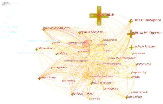 The distribution of keywords is displayed in Figure 8. The top 10 keywords are listed in Table 7, ranked by the number of publications. Keywords of big data, artificial intelligence, machine learning, business intelligence, data mining, predictive analytics, forecasting, big data analytics, decision making, and data analytics are included.