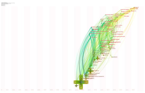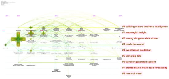 The time zone of the hotspot is exhibited in Figure 9, and the developing history of keywords and cluster visualization is illustrated in Figure 10. Findings show that data mining is the first occurred keyword (2012). It is followed by technology, decision making, big data, large amounts of data, management science, business process, software reliability, and decision support system in 2013, where the topic of decision making, and big data are the strongest burst topic during the entire developing history. Keywords of business intelligence, social networking (online), forecasting, AI, digital storage, competitive intelligence, data analytics, competition, information system, predictive analytics, and weather forecasting burst in 2014. Keywords of analytics model, big data analytics, commerce, learning system, machine learning, data handling, administrative data processing, and manufacturing appeared in 2015. Keywords of information performance intelligence, algorithm, sale prediction, information analysis, distributed computer system, metadata, predictive modeling, data visualization, support vector machine (SVM), privacy, regression, and demand regression analysis emerged in 2016. Keywords of system, data science, management, learning algorithm, classification, efficiency, information, management, health care, machine learning technique, predictive model, quality management, big data application, personality knowledge, social media, dynamic capability, knowledge management, competitive advantage, perspective selection and risk burst in 2017. In 2018, keywords of design, internet, neural network (NN), random forest (RF), machine learning (ML) model, deep learning (DL), smart city, knowledge discovery, risk assessment, internet of things (IoT), and social network occurred. In 2019, AI, intelligent computing, time series, advanced analytics, literature review, crime, data technology, decision-making, big data analytics, customer satisfaction, and innovation burst. Hotspots of service, user acceptance, industry 4.0, and sentiment analysis appeared in 2020. In the latest year of 2021, the keywords of AI, COVID-19, information technology (IT), healthcare, data analysis, 5G, mobile communication system, hospitality, text mining, and satisfaction burst in publications.