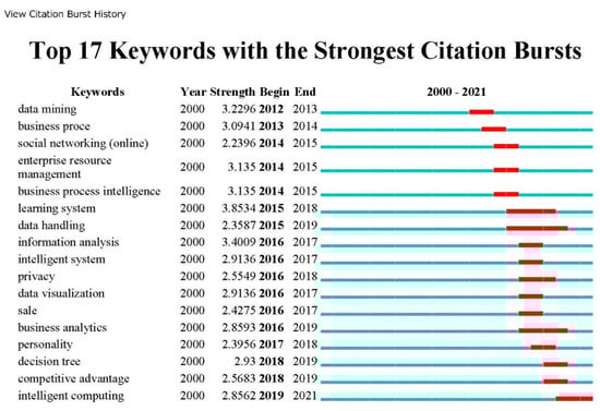 The 17 keywords with the strongest citation bursts are listed in Figure 11. Based on the timeline, burst keywords are listed as follows: data mining (2012–2013), business process (2013–2014), social networking (online) (2014–2015), enterprise resource management (2014–2015), business process intelligence (2014–2015), learning system (2015–2018), data handling (2015–2019), information analysis (2016–2017), intelligent system (2016–2017), privacy (2016–2018), data visualization (2016–2017), sale (2016–2017), business analytics (2016–2019), personality (2017–2018), decision tree (DT) (2018–2019), competitive advantage (2018–2019), intelligent computing (2019–2021).