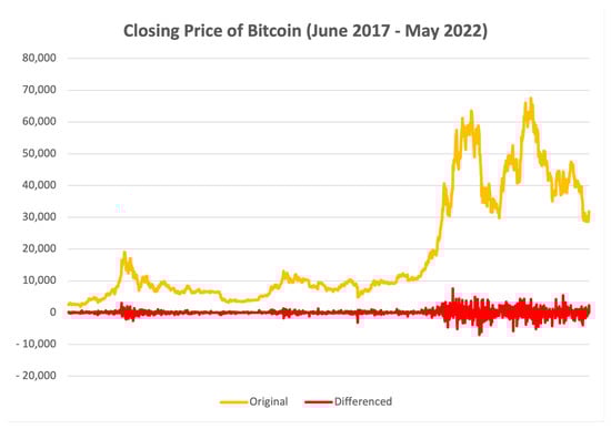 Bitcoin’s daily closing price from June 2017 to May 2022. We plot the original time series in yellow and the detrended one in red.