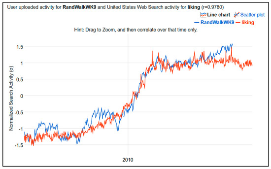 Screenshot of identified spurious correlation from Google Correlate. RandWalkWK9 is a random walk variable generated by adding successive standard normal draws to generate a weekly time series. The time frame for the weekly time series is from January 2004 through January 2016.