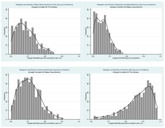 Figure 4 provides histograms and density plots for the maximum spurious correlation identified per random variable, conditioned upon observation of a correlation above 0.6. Whereas the time series random walk probability distribution generates consistently very high spurious correlations, the cross-sectional gamma (1, 1) random variable typically finds spurious correlations that are lower but substantial. The distributions appear skewed, likely because of ceiling effects and censoring. All distributions are censored at a correlation of 0.6 because Google Correlate did not report results if no correlations were found above 0.6. Thus, for some distributions, a substantial portion of the observations in the uncensored distribution would have been below 0.6 (e.g., for the spatially correlated distribution, 32 percent of observations were censored). On the other hand, the random walk distribution appears to be encountering a ceiling effect, with few censored observations below 0.6 (1%) but many observations close to the theoretical maximum of one.