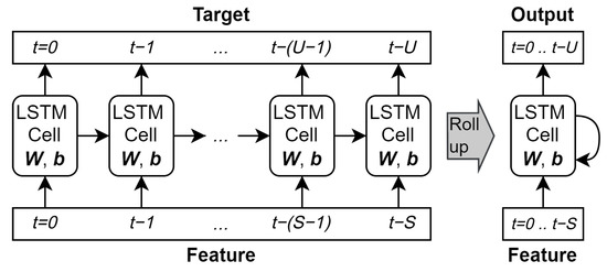 The feature sequence (length S) is input to the LSTM cell chronologically, up to the most recent value at , and can be depicted “unrolled” (left) with the same cell multiple times, or “rolled up” showing one cell and the recurrent loop. In either case there is only one set of -weights (, , etc) and -biases (, , etc). Between time steps, the LSTM cell passes and to itself in the next time step.