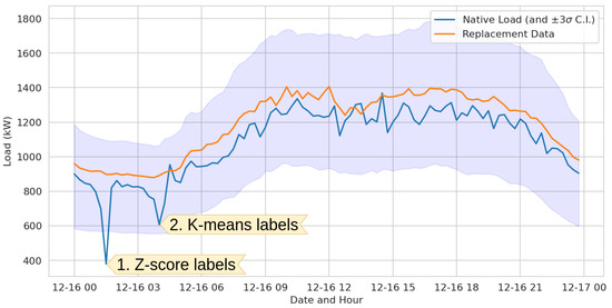 where h is the hour of the day (0 to 23), is the ith value at hour h, is the mean for hour h, and is the standard deviation for hour h. Since many of the hour-weekday subsets are highly non-Gaussian, k-means clustering is executed with the original k guess as equal to the number of outliers labeled by z-score. In this way values that are geometrically close to z-score outliers are labeled, even if they are less than three standard deviations from the mean. K-means clustering iteratively assigns all points to one of k geometric clusters, calculates the centroid of the points, then redefines clusters based on the centroids, and stops when some criterion is met, such that: