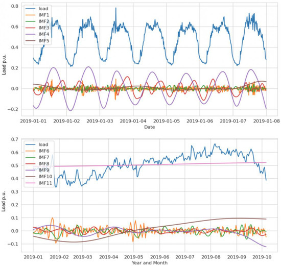 A good example of the resultant IMFs is in Figure 9 from Hotel 1. The last two IMFs represent the overall trend and annual seasonality. The IMFs 3–5 represent daily and intra-daily periodicity. IMFs 3 and 4 have Pearson correlations of 0.50 and 0.73 concerning the original load data. The statistical properties of the IMFs differ: IMFs 1–5 are somewhat Gaussian and IMFs 10–11 are extremely non-Gaussian.