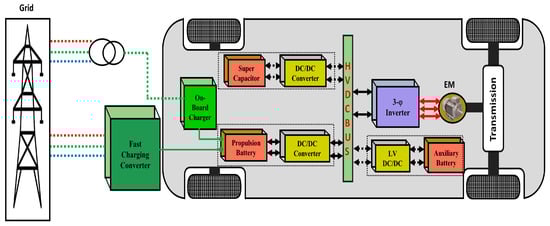 The whole power supply system of an EV can be divided into three parts, namely: (i) battery charging system, (ii) powertrain, and (iii) regenerative braking. The block diagram of a typical EV with its power supply system is depicted in Figure 1. This figureshows that a particular DC–DC converter may be required for an individual energy source to be integrated into the high voltage (HV)-DC bus of the EVs and PHEVs powertrain [6].