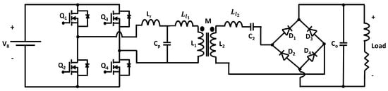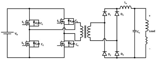 The most popular charging converter in high-power appliances is the isolated phase-shifting-based full-bridge converter (PSFBC), illustrated in Figure 2. A phase-shifted full-bridge converter provides various desirable advantages over other charging converters, such as simple control techniques, low current stress on devices, etc. [6]. Moreover, the phase-shift modulation topology provides an alternative solution for a wide-range charging operation [55,56,57]. The isolated PSFBC has two operation stages: the DC–AC converter (inverter) stage with a high-frequency transformer, and the AC–DC rectification stage. As shown in Figure 2, both stages consist of four power-switching elements to make a full-bridge like a conventional full-bridge converter. The isolated phase-shifted full-bridge converter has ten working modes which are discussed in [58].