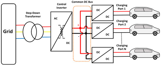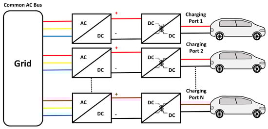 Offboard charging can reduce the impact of EVs on the grid with proper planning and managing peak demand [54]. A fast charger is required to mitigate the refueling problem, which requires more time for refueling/recharging, fewer charging stations, and a lower driving range [7]. The fast-charging architectures are usually classified into two categories: (i) common AC-bus architecture; and (ii) common DC-bus architecture [84,85]. In the typical AC-bus architecture, each fast charger consists of individual AC–DC conversion stages with a high-frequency transformer, as depicted in Figure 5. On the other hand, the typical DC-bus architecture consists of one central AC–DC conversion stage with a low-frequency transformer, which is shown in Figure 6 [6].