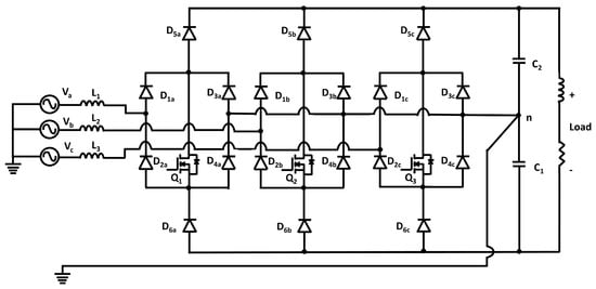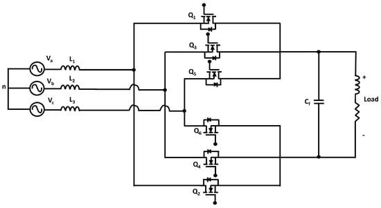 In EV applications, three-phase bridgeless boost rectifiers are conventionally utilized as the interface between the charging section of EV and the three-phase power supply of the grid due to their capability of converting three-phase AC into DC [86,87]. Among several types of PWM rectifier topologies, three-phase voltage source PWM rectifiers (i.e., three-phase bridgeless boost rectifiers) are widely utilized in electric vehicle applications and power generation due to their good voltage regulation, high efficiency, small input current, and output voltage filters size, and fast switching [88,89,90,91,92,93]. Hence, low-frequency harmonics can be quickly suppressed due to the high switching frequency. The unity power factor can be obtained with the most popular pulse-width modulation (PWM) rectifier topology [88,92]. Figure 7 shows the three-phase bridgeless boost rectifier, which takes advantage of the power factor correction (PFC) boost converter [6]. As the name suggests, this rectifier can boost or step up the output DC voltage and is capable of bidirectional power flow with the regenerative braking of the electric vehicle, which increases the battery efficiency [92].