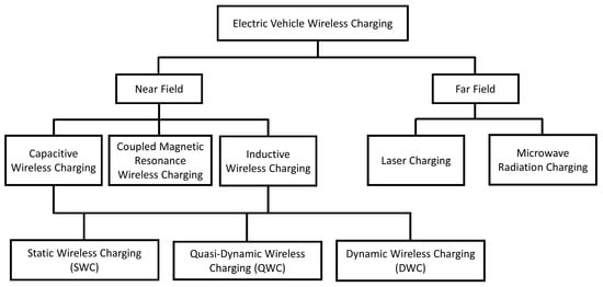 The WPT can be divided into three main categories according to the power accumulation and transfer medium: (a) microwave radiation type (far-field) WPT; (b) electric field (capacitive) coupled type WPT; and (c) magnetic field (inductive) coupled-type WPT [41,123,124]. The classification of the wireless power transfer system of the electric vehicle is illustrated in Figure 9.