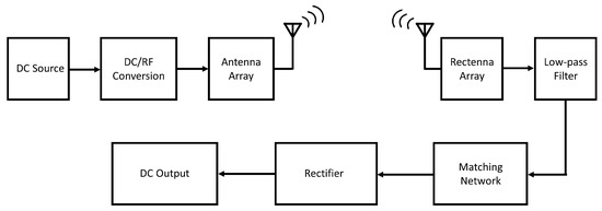 The microwave radiation wireless power transfer system is mainly used in long-distance power transfer, which is depicted in Figure 10, where the energy transfers to the output through DC/RF conversion, transmitting antenna, receiving antenna, low-pass filter, matching network, and rectifier [16].