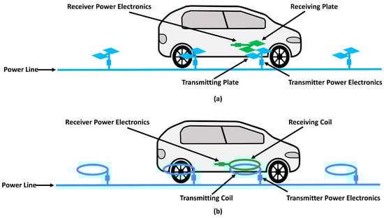 The physical implementation of two approaches to deliver energy wirelessly to electric vehicles from an electrified roadway: (a) inductive wireless power transfer (WPT) using coils (embedded in the roadway and the vehicle) that are coupled through magnetic fields; and (b) capacitive WPT using plates coupled through electric fields [54].