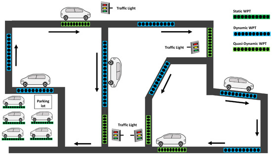 QWC operates between static wireless charging and dynamic wireless charging. When the vehicles stop for a traffic light, bus stop, or taxi stand, a quasi-dynamic wireless charging system starts charging the car wirelessly via underground fitted technology [129]. EVs can be charged with quasi-dynamic wireless charging (QWC) systems while they are stopped for a short time, such as at traffic lights. This can potentially decrease the requirements of enormous energy storage and increase EVs’ overall driving range [133].