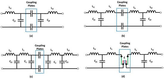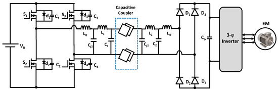 Several topologies of CPT have been discussed in [16], where it was shown that several kilowatts (i.e., around 2.4 kW) of power could be achieved at an air gap of 150 mm. Although the CPT system provides lightweight, cost-effective couplers and less sensitive power transfer due to misalignment compared to magnetic field-coupled wireless power transfer systems, the power transfer capability of CPT is minimal due to the minimal capacitance between the road and conductive vehicle plates. The latter requires a very high frequency for effective power transfer [54,125]. This issue can be solved by reducing the impedance of the power flow channel with a high operating frequency [16].