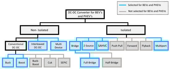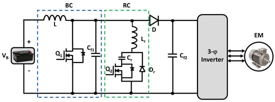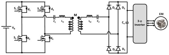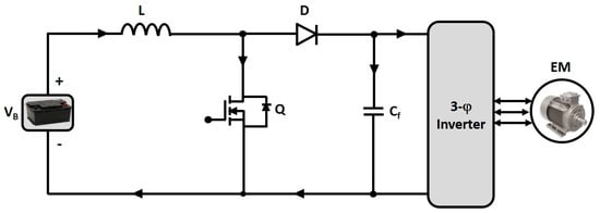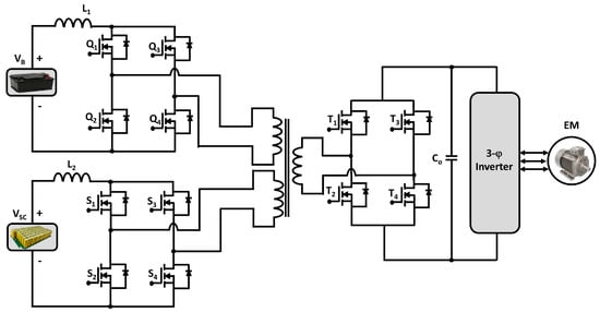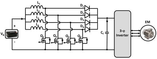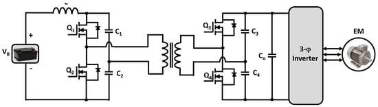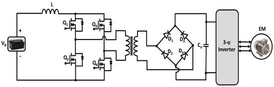 In the EV powertrain, all the electric input sources are connected to a HV–DC bus by an individual DC–DC converter, and the output three-phase electric motor (EM), i.e., the main load of the EV, is powered from this HV–DC bus through a three-phase inverter which drives the EM [8,9,10,11]. Here, the voltage level of this HV–DC bus of the EV is around 400–750 V. Moreover, moving the EV via an EM from electric batteries, a DC–DC voltage is required because the batteries’ output voltage is much lower than the required voltage of EM. A traction inverter is needed to drive the EM by converting the DC batteries into variable-frequency AC [12]. However, a disagreement could be made for stepping up the output AC voltage level of the inverter by utilizing a high-voltage transformer instead of a DC–DC converter. This is due to its having several essential advantages, such as reliability, cost-effectiveness, compact size, and lightweight DC–DC converters appear to be excellent candidates for EVs and HEVs powertrains [13]. An extensive discussion on the EV powertrain converter topologies is presented in Section 3 and Section 5. Finally, regenerative braking, capable of charging EV batteries between driving-braking times by capturing electricity, was discussed.