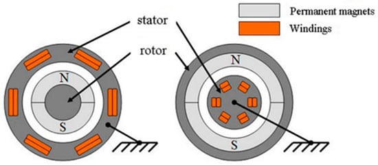 - Nerg, J.; Rilla, M.; Ruuskanen, V.; Pyrhönen, J.; Ruotsalainen, S. Direct-Driven Interior Magnet Permanent-Magnet Syn-chronous Motors for a Full Electric Sports Car. IEEE Trans. Ind. Electron. 2014, 61, 4286–4294. [Google Scholar] [CrossRef]