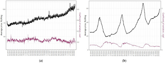 There are different approaches for spatial prices analyses. The first implies the calculation of spatial heterogeneity in prices. One typical measure of regional price disparities is the coefficient of variation (CV) [8,23,27,28,34]. There are, however, several more options for deeper analysis since the price data are georeferenced [3]. For example, the estimation of the seasonal variation using the monthly average price and the calculation of the spatial variation based on the average market prices [25]. Since we noticed the variability of the variation of prices in time, we estimated the total variation for all markets for the whole period, as well as spatial price variation for each day of the analyzed period. Another approach considers the relative position of territories, focusing on the similarity and difference in prices among neighbors. There exist different indexes and models to describe the prices of a territory in correlation with the prices of neighboring areas [14,25,27]. Probably, the most famous and widely used is the Moran’s I index [12,20,21,23,27].