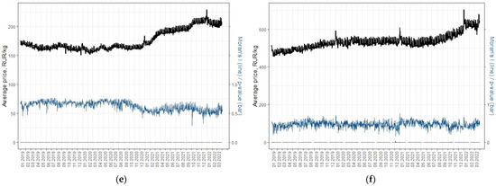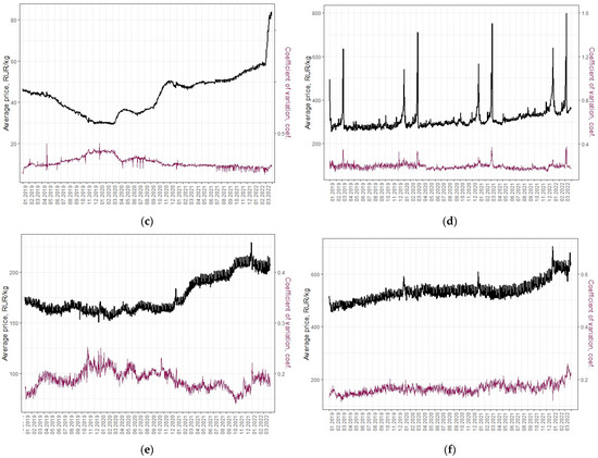 Daily average regional price of Pasta (a), Potatoes (b), Sugar (c), Candies (d), Poultry meat (e), Butter (f) and respective coefficients of variation from 1 January 2019 to 31 March 2022.
