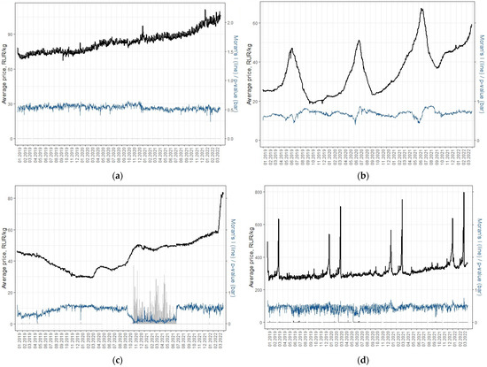 The analysis showed that the regional variation in the price of Potatoes is higher than in other product categories (Table 2). The highest value of the coefficient of variation was 0.599 for Potatoes on 28 September 2019. The lowest value of the coefficient of variation (0.102) was registered for sugar on 24 February 2022.