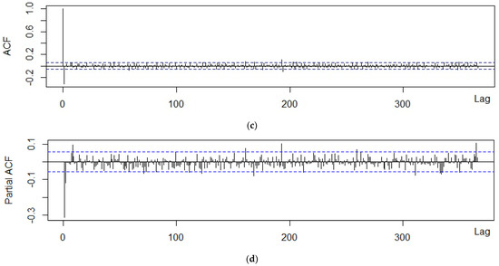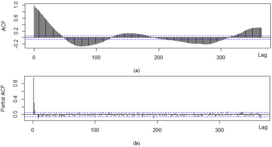 In order to take the seasonality of the data into account, we analyzed the shape of the time series as well as both autocorrelation function (ACF) and partial autocorrelation function (PACF) graphs [36,37]. The ACF expresses the internal correlation between observations in a time series separated by different lags as a function of time lag, and the PACF describes the direct relationship between an observation and its lag. These indicators represent correlations of the residuals that remains after removing the effects, which are explained by the earlier lag(s). The ACF graph helps in choosing the appropriate values for the ordering of moving average terms and the PACF graph is useful for the autoregressive terms [38].
