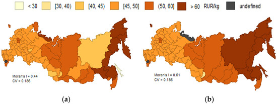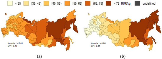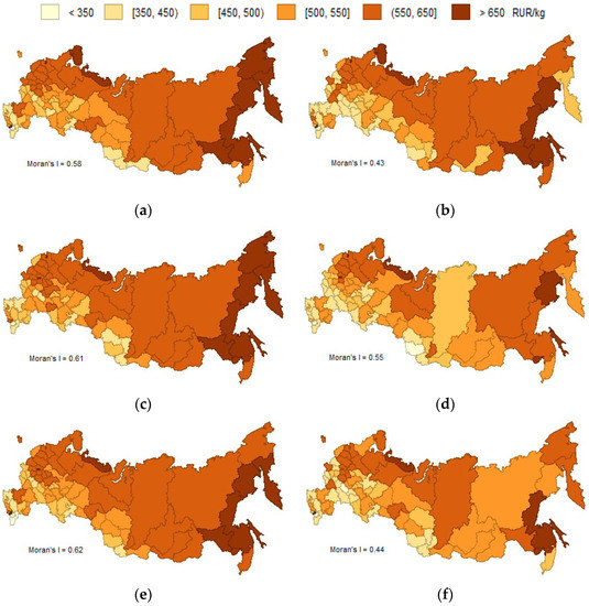 This interest in the analysis of spatial dependencies has obvious origins: spatial analysis allows identifying the limitations of regional cohesion [22,23] to assess shock propagations [24] and to ensure the targeting of measures to ensure public food security [25,26]. We believe the understanding of regional price differences is essential for basket-of-goods comparability, more accurate estimation of regional price parities (RPPs) and studies of regional differences in standards of living [3,27]. Researchers underline the importance of account for price differences when assessing regional economic disparities [8]. When neglecting these issues, one may obtain misleading results [23].