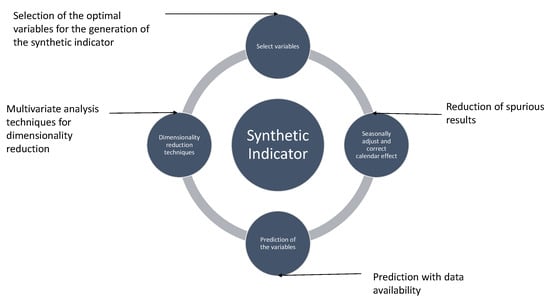 The use and construction of synthetic indices as a source of knowledge of economic evolution is not new, and dates back to the work carried out during the first part of the last century by the National Bureau of Economic Research of the United States [21] and continues nowadays. For instance, Bitetto et al. [16] employs dynamic factors to develop an index which is able to identify banking and debt crises in both strong and developing economies, while Liang et al. [22] used a dynamic factor model to forecast inflation in China. In a similar vein, Anesti et al. [23] and Mumtaz and Musso [24] went a step further by, respectively, proposing a dynamic factor model with time-varying parameters and stochastic volatility to study of the impact of both regional and global volatility on the global economy and a release-augmented dynamic factor model that improves the standard dynamic factor model when making one-time-ahead quarterly GDP forecasts.