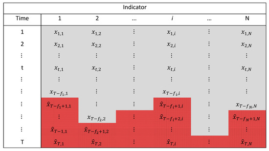 Figure 2 schematically shows the observed and predicted data structure for each series; where represents the observed value of the i-th indicator during instant t and represents the prediction associated with the i-th indicator corresponding to the instant (with, ), with T denoting the total number of periods (the time horizon), N denoting the number of elemental indicators and (≤12) denoting the number of unobserved periods (months) (to be predicted) until the i-th series is completed at instant T.