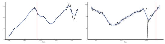 The result of calculating the synthetic index using the app option “observed data” with the eight indicators selected in model 9908 is shown in the left panel of Figure 4 during the period January 2009–October 2022. As an element of comparison, in the right panel of Figure 4, the monthly GDP series of the Comunitat Valenciana, available until 2021, is graphically represented. In both panels, a smooth LOESS curve is included to make it easier to observe their underlying evolutions. Likewise, vertical red lines are used in both panels to indicate the periods during which the other series is (not) available.