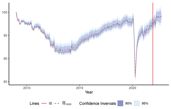 Figure 5 graphically shows the synthetic index together with the estimation of its bootstrap confidence intervals at 80% and 95% confidence. Several facts stand out when analysing this figure. First, the uncertainty bands are not homogeneous during the entire period. During the initial years and at the time of the pandemic lockdown, the levels of uncertainty are lower. The highest levels of uncertainty are observed during the prediction/extrapolation period. Second, the bootstrap intervals are not symmetric with respect to the base index, , nor with respect to the mean index, , with the intervals being significantly more asymmetric with respect to the former. In general, the interval range towards the upper end is greater than it is towards the lower end. Third, as a rule, the index series and nearly coincide, drawing very similar paths. In summary, the bootstrap methodology is revealed to be adequate to approximate uncertainty in the estimation of the synthetic index of activity and economic forecast of the Comunitat Valenciana.
