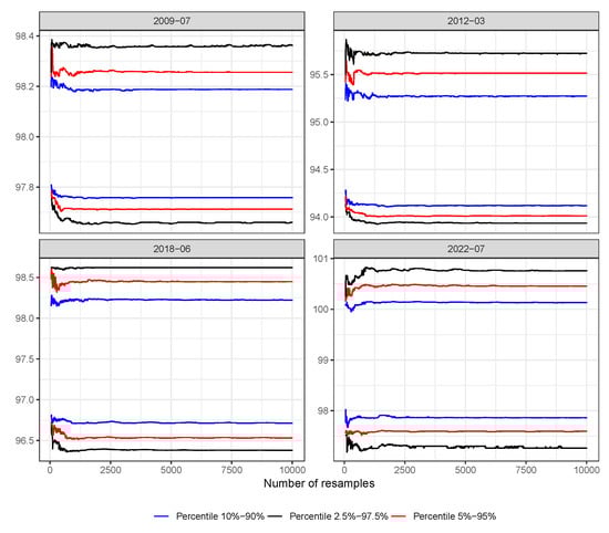 In order to answer the questions raised in the context of this research, we simulated resamples—a number above that recommended by [52,53] and equal to that recommended by [30]—and (i) studied, as a function of the number of resamples b, when stability is reached; and (ii) compared the differences observed between the limits of the intervals obtained for different numbers of resamples, . The analyses were also carried out considering the possible impact of the coverage of the interval used in the results. Indeed, as shown in Figure 6, where the limits of the confidence intervals obtained for the synthetic index at four different time points are shown as a function of the number of resamples b, not all the interval limits tend to stabilise in the same number of resamples.