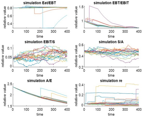 Steps (iv) and (v) encompass the simulation of six particular ratios and the relative EVA measure’s calculation—400 steps were used in one scenario for the year with 106 scenarios. The special Matlab functions and reflecting the t-copula function were utilised to generate random numbers and simulations. A presentation of 20 scenarios (colored), including their interdependencies, is shown in Figure 1, where asymmetry, fat tails, and jumps are apparent and verified. Likewise, every ratio demonstrates a different and unique distribution shape. Furthermore, the distribution of the relative EVA measure for one replication is illustrated in Figure 2 with decreasing distribution quantiles and negative asymmetry.