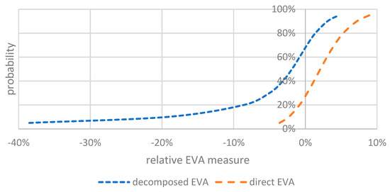 The last step (iii) involves a simulation of the direct relative EVA measure using 400 steps in one scenario for a year with 105 scenarios. The Matlab function is used to generate random numbers and simulations. In step (iv), step (iii) is replicated ten times, and the distribution of the direct relative EVA is obtained due to the relative confidence interval of a standard error being determined to be less than 0.1 (see the results in Table 8 and Figure 4). The precision of the distribution in all parameters is less than 5%.